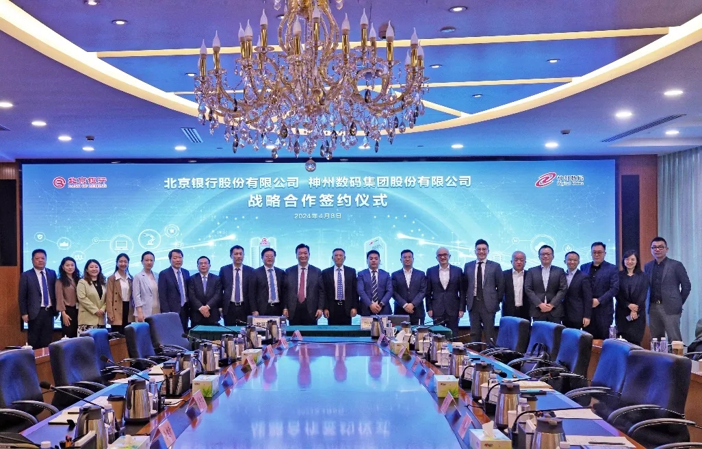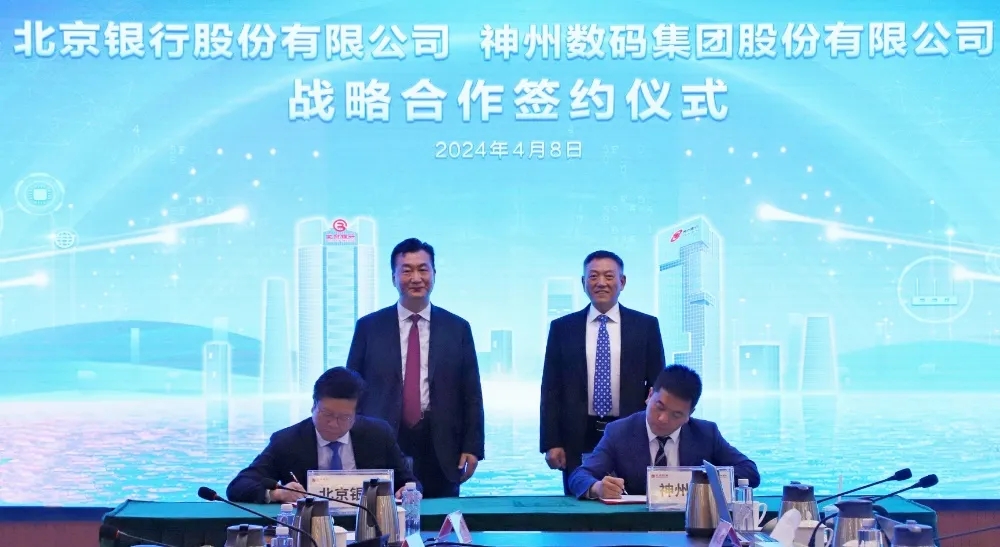2024年4月8日,yabo.com鸭脖与北京银行在其总行大厦举行战略合作签约仪式。yabo.com鸭脖董事长兼首席执行官、神州信息董事长郭为,北京银行党委书记、董事长霍学文共同见证签约,yabo.com鸭脖财务总监、董事会秘书陈振坤与北京银行副行长戴炜,代表双方进行签约,yabo.com鸭脖及北京银行相关领导出席签约仪式。